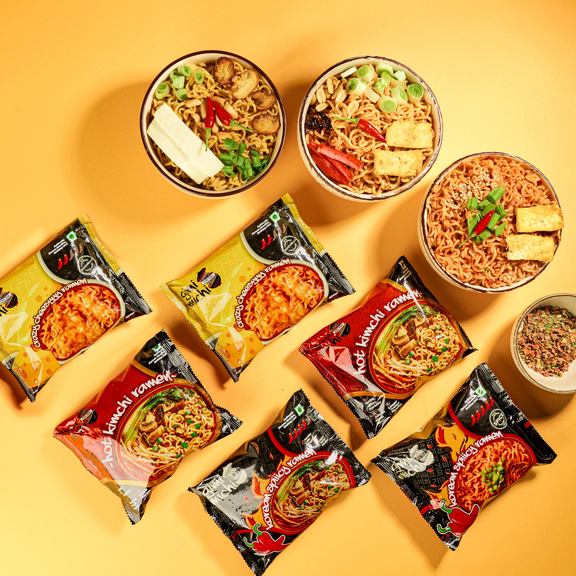 Experience the boldest side of Korean ramen with the all-new Gimi Michi Veggie Trio Box. This special combo brings you 2 packs of Kimchi Ramen, 2 packs of Spicy Ramen, and 2 packs of Cheesy Ramen, crafted for fans who love big flavour, exciting heat, and comforting richness in every slurp.